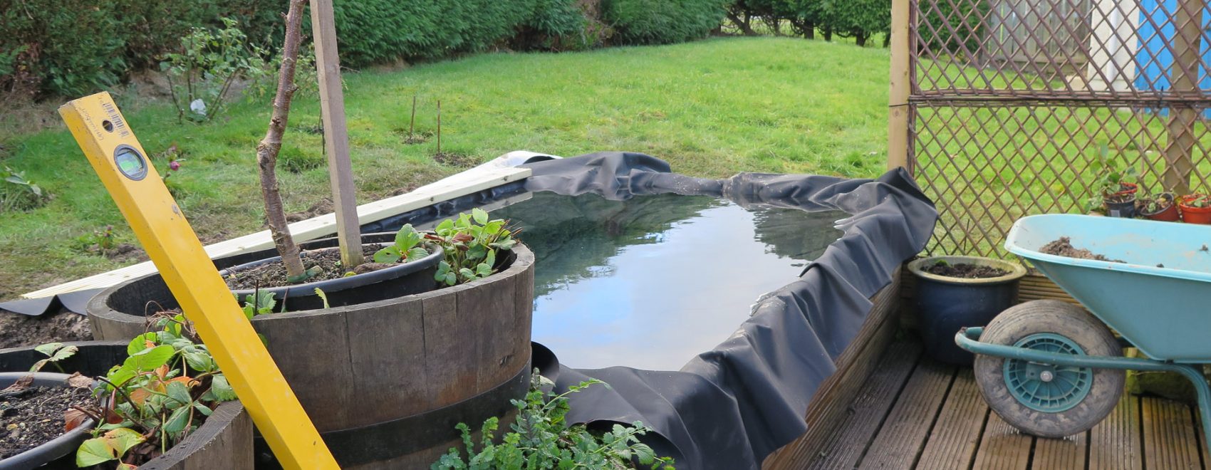Once the decision had been made, I ordered a pond liner and Bob did the hard graft with a spade digging out the heavy clay and building-rubble that was buried in the small bank of grass where the pond was going to lie, on a couple of chilly January days in 2017. I had checked the council guidelines and was confident that a pond would be considered as a landscape feature and would therefore not need permission to have it in the garden. It was certainly not any of the alternatives that needed permission like a wall or a fence.